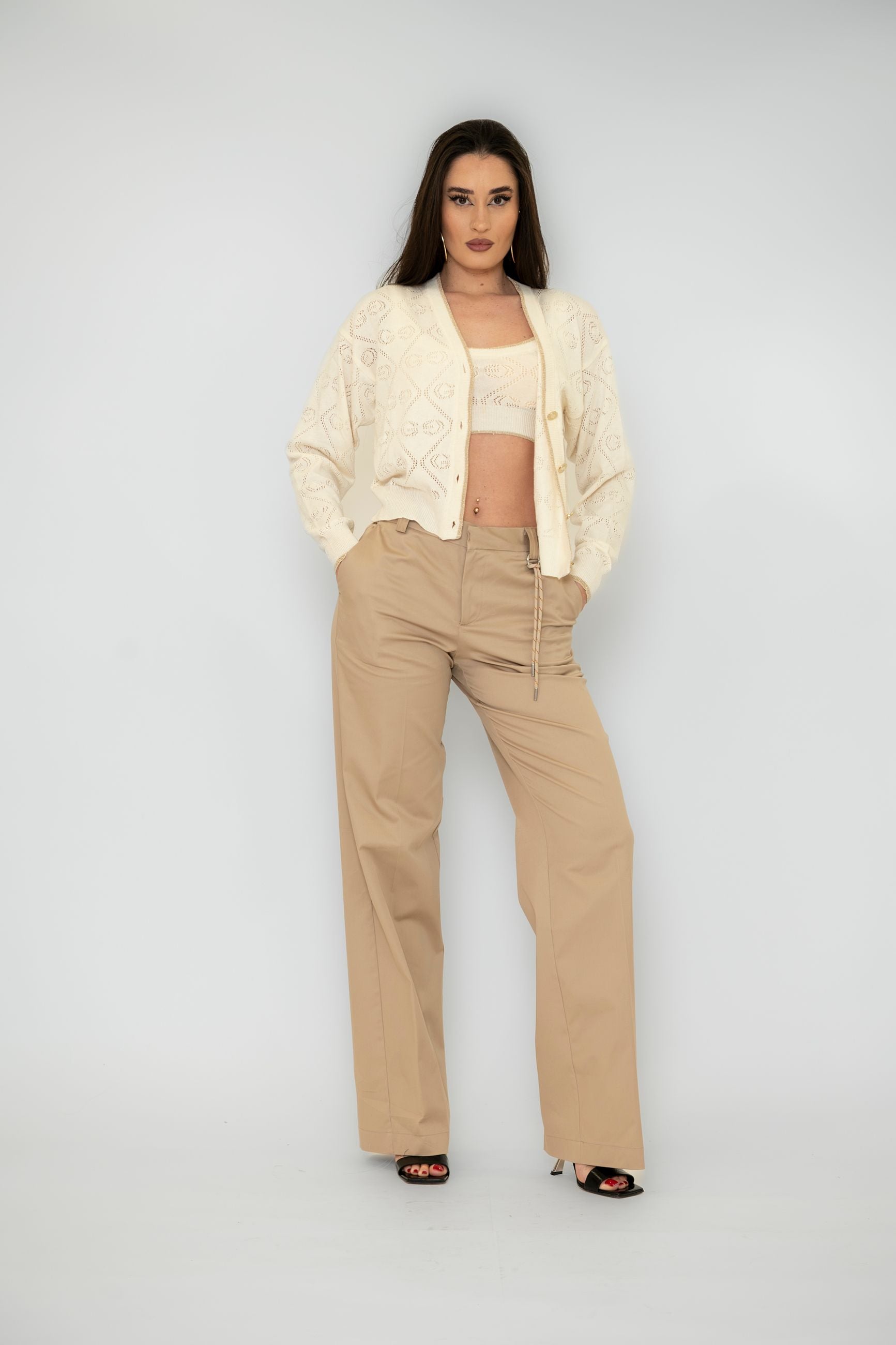 cardigan in maglia traforata con profili in lurex e bottoni in metallo oro