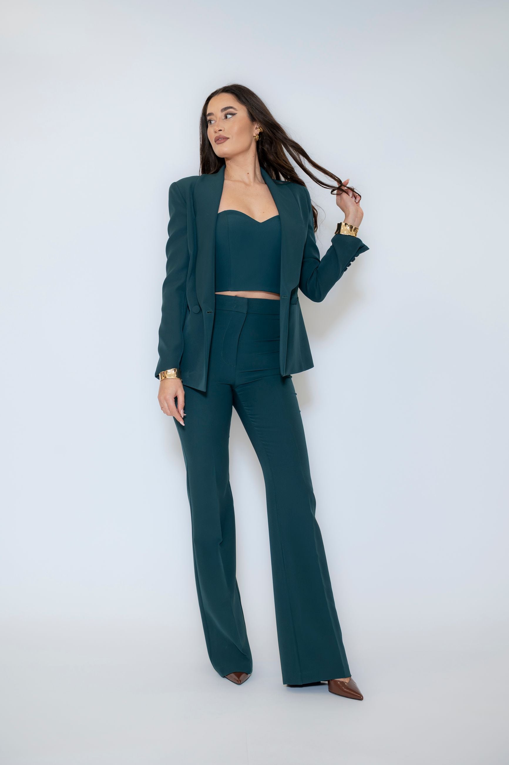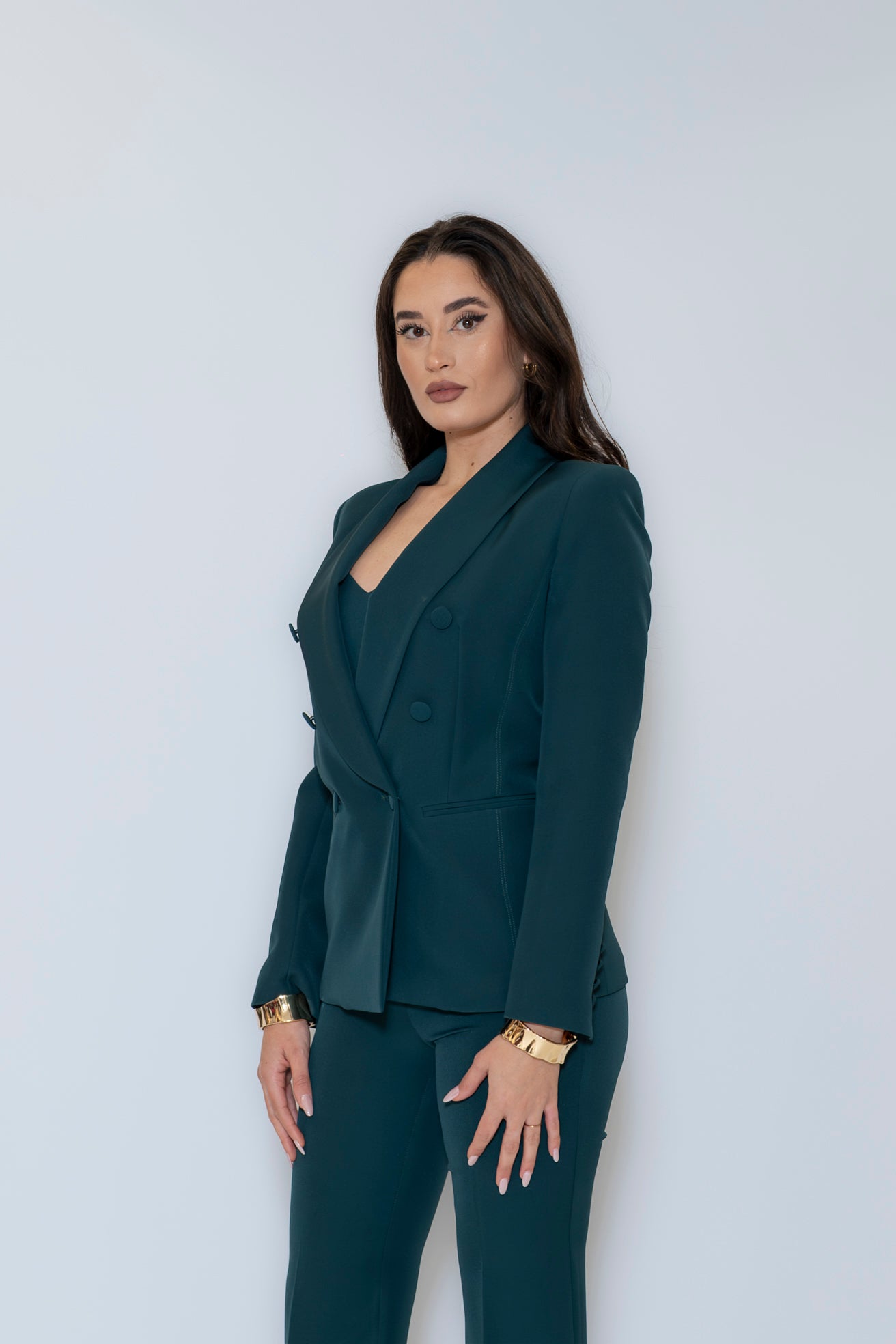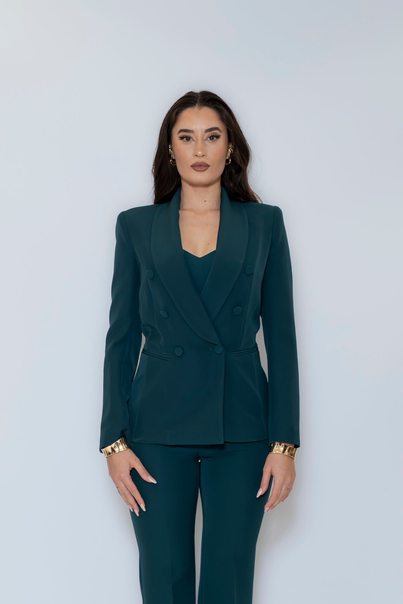 blazer doppiopetto con spalline leggermente imbottite e bottoni rivestiti. Il blazer doppiopetto è perfetto indossato con un paio di pantaloni eleganti abbinati, ma è capace di elevare anche il tuo outfit quotidiano insieme ai tuoi jeans preferiti.