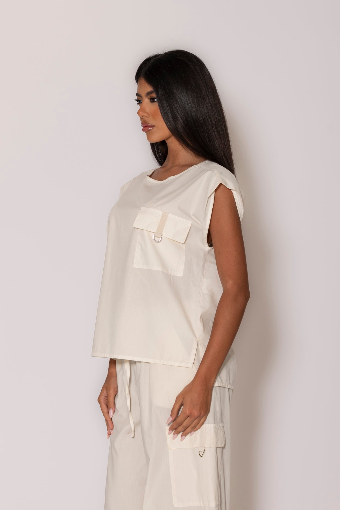 Tasca laterale con patta e bottone tono su tono, bordo asimmetrico leggermente più lungo sul retro