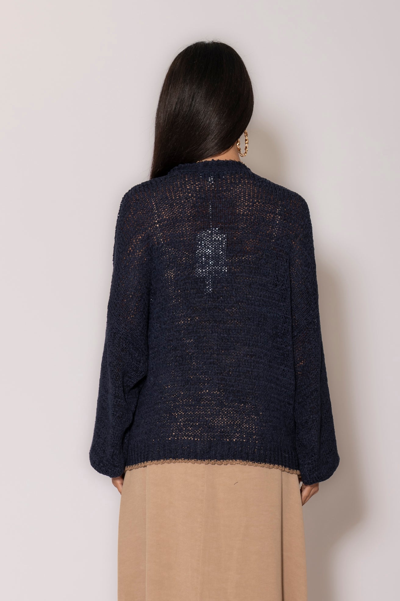 Silhouette oversize e rilassata con lavorazione traforata che disegna raffinati effetti vedo-non-vedo